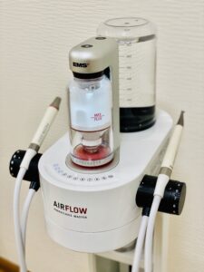 エアーフローは微細な粒子パウダーと高圧のウォータースプレーを歯の表面に噴射して汚れを落とす機械です。