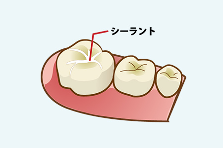 シーラントと呼ばれる歯科用の樹脂で、お子さまの奥歯の表面にある溝を埋める治療です。この溝には汚れが溜まりやすく、歯ブラシで十分に落としづらいこともあって、むし歯の原因になってしまうからです。シーラントにはフッ素が含まれており、歯質の強化にも役立ちます。