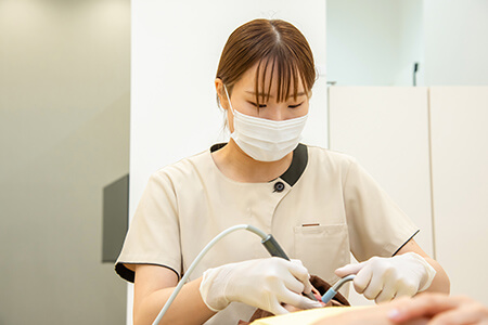 スケーラーと呼ばれる専用の器具を使って、歯の表面や歯と歯ぐきの境目に溜まった汚れをきれいに除去します。普段の歯みがきでは落としにくい汚れがきれいになり、処置後は歯の表面をツルツルに仕上げるため、汚れがつきにくくなって、歯周病やむし歯の予防に役立ちます。